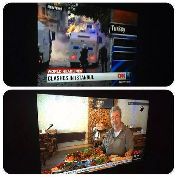 Фактично, як і під час Арабської весни, у Туреччині міжнародне висвітлення протестів часом було кращим, ніж місцеве. журналістами. Ось CNN International показує протести, в той час як CNN Туреччина показує кулінарне шоу:
