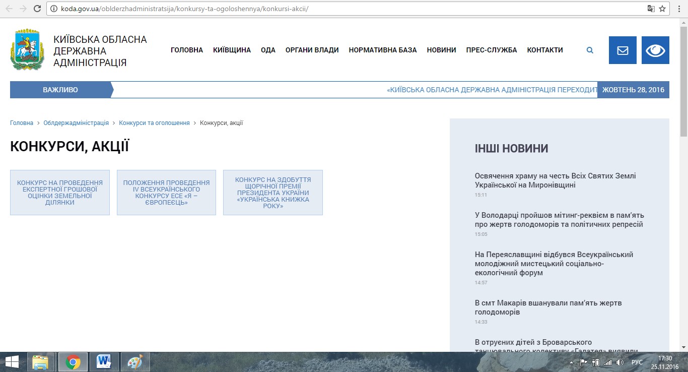 По состоянию на 17:30 и 23:08 25 ноября на официальном сайте КОГА в разделах: “Конкурсы и объявления”, “Конкурсы, вакансии” и “Новости” список претендентов на посты вице-губернаторов Киевщины так и не появился.