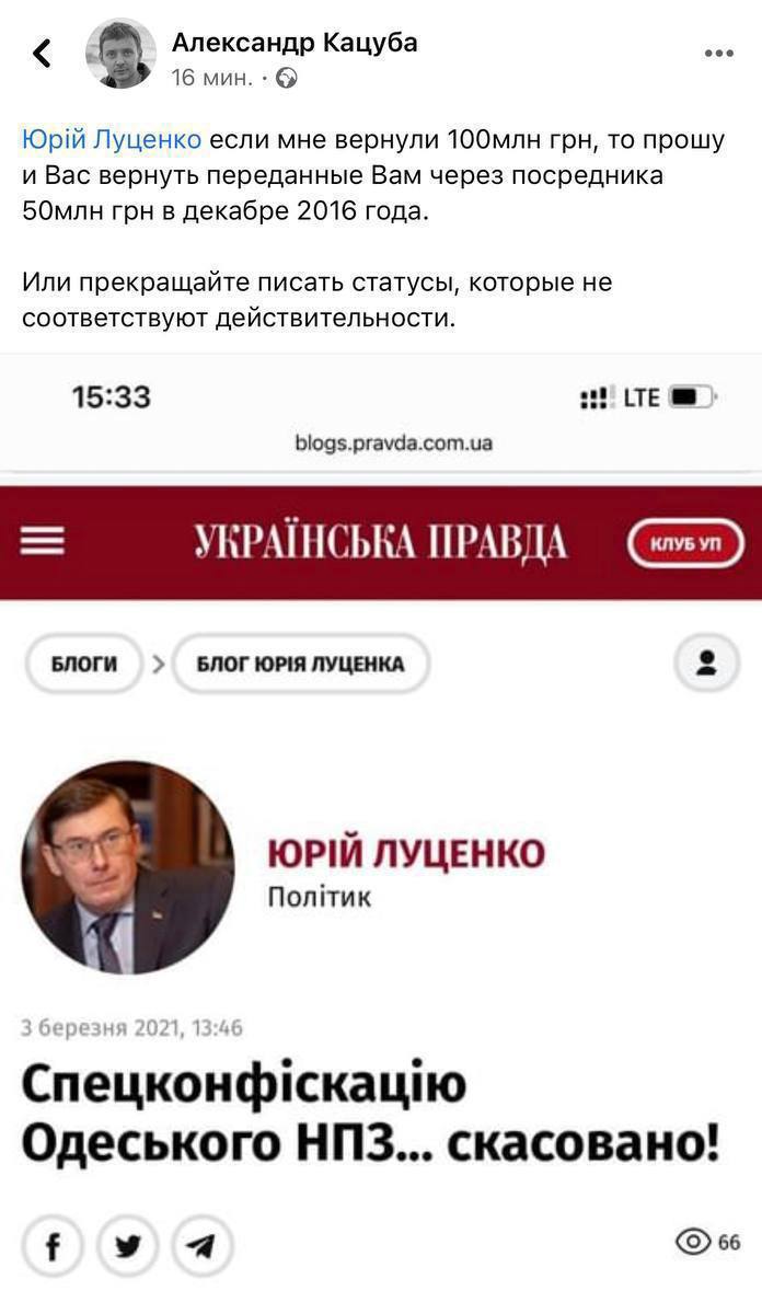 Телеграмм-канал “Украинский обозреватель” пишет: “Юра, тебе бы лучше молчать. А Венедиктовой по этому заявлению вполне можно возбудиться. Юра по колонии соскучился. А так — вторая ходка уже будет. Стремяга.” Речь идет о том, что Луценко, войдя в роль честного человека, возопил на “Украинской правде” о несправедливости спецкофискации. Луценко утверждал в статье, что Кацубе вернули 100 миллионов гривен, которые в свое время Луценко типо конфисковал. И тут же нарвался на “ответку” от Кацубы, который потребовал вернуть ему 50 миллионов взятки, которые он передавал Юрию Витальевичу. Луценко, вообще лучше бы Кацуб не трогать. По нашим данным, за Кацубцу Луценко платили трижды. И отнюдь не смешные суммы в 50 миллионов гривен. И Венедиктовой действительно самое время “возбудиться” и предложить тому же Кацубе в обмен на статус свидетеля — рассказать всю правду о взятках для Луценко. И был бы весьма показательная посадка. За Луценко в этот раз вряд ли кто-то будет митинговать. Ужь слишком омерзительно он выпрашивал должность Генпрокурора, и слишком омерзительно потом торговал уголовными делами и врал как сивый мерин.