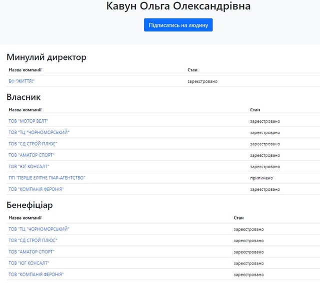Під час виборів до парламенту 2019 року у лавах «Слуги народу» опинилася якась Ольга Олександрівна Кавун, заступник директора меблевої фабрики ТОВ «Компанія Феронія», що знаходиться в Одесі, а також співвласник одеського салону краси G. Bar French. Її включили до списку під номером 78, що з огляду на рейтинг партії стовідсотково гарантувало місце в парламенті.