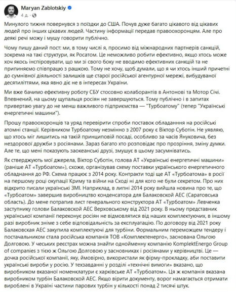 АО «Украинские энергетические машины», до недавнего времени АО «Турбоатом», которым с 2007 года руководит Виктор Субботин, довольно плотно сотрудничает с россией. Об этом сообщил народный депутат Марьян Заблоцкий. С его слов, он уже обратился в правоохранительные органы. Судя по всему, «Турбоатом» не перестал торговать с «Росатомом» даже после начала полномасштабного вторжения российских оккупантов на территорию нашей страны. Как утверждает Заблоцкий, у них есть действующий контракт на поставку оборудования для Балаковской АЭС (Саратовская обл.).